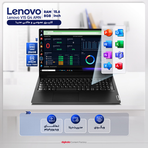 لپ تاپ لنوو V15 V15 G4 AMN یکی از خوش قیمتترین محصولات اداری و تجاری شرکت Lenovo است. این لپ تاپ با ظاهری ساده و عملکردی بالاتر از انتظار به یکی از پرفروشترین محصولات این شرکت تبدیل شده است. وزن سبک، طراحی بسیار ساده، قدرت سخت افزاری مناسب و استفاده از تکنولوژیهای روز، لپ تاپ V15 را به یکی از بهترین و مقرون به صرفهترین گزینهها برای انجام امور روزمره تبدیل کرده است. این لپ تاپ به پردازنده مرکزی Athlon Silver 7120U شرکت AMD با فرکانس نهایی 3.5 گیگاهرتز مجهز شده است و در کنار آن، هشت گیگابایت رم از نوع LPDDR5 و 256 گیگابایت حافظه ذخیرهسازی SSD برای آن در نظر گرفته شده است تا در مجموع شاهد سرعت بسیار بالای آن در انجام امور مختلف باشیم. علاوه بر این، صفحه نمایش Full HD با پنل TN از دیگر ویژگیهای کلیدی این لپ تاپ به شمار میرود.